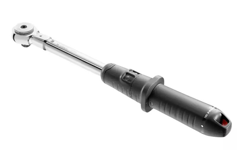 Facom 209 A à déclenchement automatique avec signal sonore, double échelle (avec Nm et ft.lbs) et taraudage Twin-Start pour gagner du temps grâce au réglage 2 fois plus rapide, poignée en plastique ergonomique, mécanisme éprouvé offrant une longue durée de vie, avec cliquet réversible remplaçable pour serrage à droite, précision ±4 % de la valeur mesurée, avec certificat de contrôle d'usine selon la norme ISO 6789. Fourni dans un tube de protection en plastique.