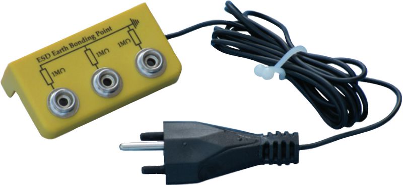 Raccordement angulaire en ABS, jaune, ligne de terre: 2m avec cosse à œillet Ø 5mm, dimensions: 70x36x23mm, chaque raccordement est muni d'une résistance de protection de 1 MΩ.
