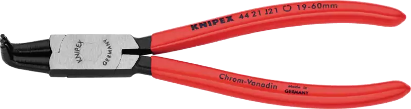 Knipex 4421, DIN 5256 D, acier électrique au chrome-vanadium, forgée, trempée à l'huile, atramentisée noire, polie, mâchoires coudées à 90° avec puissantes pointes antidérapantes, pour le montage de circlips intérieurs dans des alésages, poignées recouvertes de plastique.