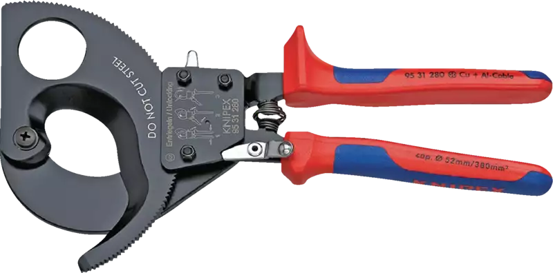 Knipex 9531, acier à outils spécial, trempé à l'huile, tranchants trempés avec meulage spécial, laqué en noir, avec gaines de branches en matière synthétique multi-composants. Pour la coupe de câbles en cuivre et en aluminium, unifilaires ou multifilaires. Maniable d'une seule main grâce à un système de cliquet, possibilité de déverrouillage à tout moment lors de la coupe, effort nécessaire faible grâce à une très grande démultiplication, avec protection contre le coincement. Non approprié pour les fils en acier, les câbles à armature en acier et les câbles métalliques !