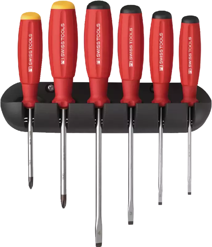 PB 8240, PB 8244, PB 8245, avec support mural, comprend respectivement 1 tournevis, acier chrome vanadium, avec manche ergonomique en 2 composants PB SwissGrip à surface Santoprene® antidérapante et maniable, pour des couples de serrage plus élevés.