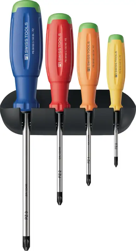 Set de tournevis RainBow SwissGrip Evo pour vis Pozidriv, avec support mural. Poignées résistantes pour un travail sans effort à des couples élevés. Code couleur par type de vis et taille de poignée. Pointes précises sur mesure, positionnement optimal dans les vis.