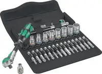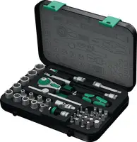 46 pièces, acier au chrome-vanadium, chromées, inserts en mousse d'aspect carbone avec inscription des dimensions, dans un étui en plastique.