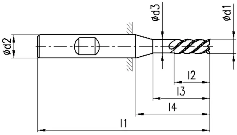 2897A, type NR, métal dur (MD), Ø 3-20 mm, revêtement TiAlN, angle d'hélice 45°, tolérance des arêtes de coupe h11, avec méplat (HB), tolérance de queue h6, courte, coupe au centre, avec chanfrein d'angle, nombre de dents 3-4, DIN 6527