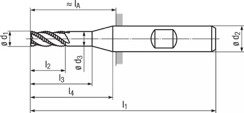 1574, type HR, acier super rapide PM, Ø 6-20 mm, revêtement ALCRONA, angle d'hélice 30°, tolérance des arêtes de coupe k12, avec méplat (HB), tolérance de queue h6, longue, coupe au centre, avec chanfrein d'angle, nombre de dents 4, DIN 844