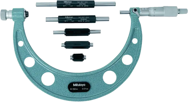 Série 104 - avec enclume de mesure interchangeable pour une plage de mesure variable. Construction légère, laquée, avec tambour gradué et douille graduée chromés mats. Faces de mesure trempées et rectifiées.