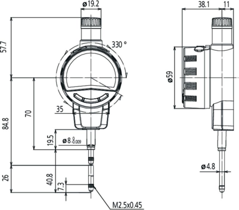 Série 543 - Comparateur multi-fonctions avec règle de mesure absolue. Réglage unique de l'origine, qui reste jusqu'au prochain changement de pile. Grand écran LCD avec affichage analogique et rétro-éclairage rouge/wert pour le contrôle des tolérances.