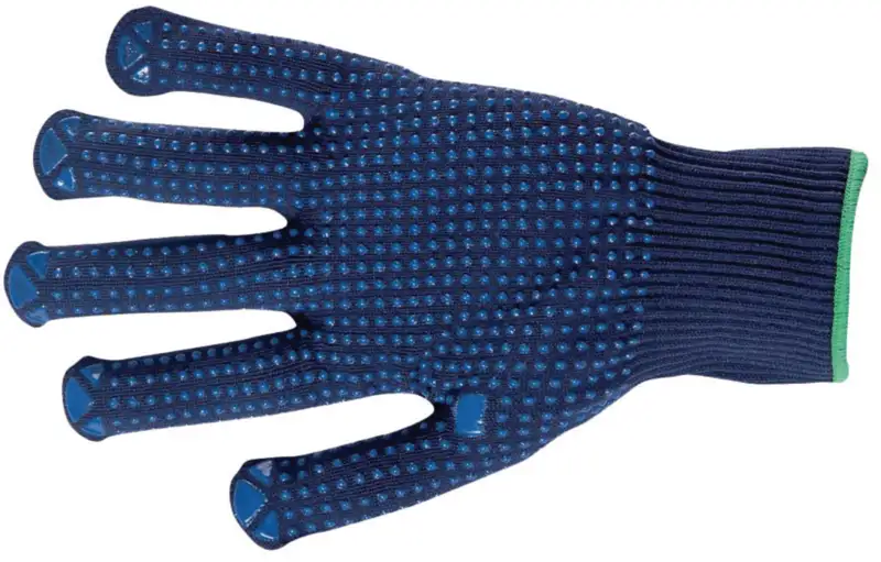 Paume renforcée avec picots en PVC (gant tricoté fin avec revêtement à points unilatéral), manchette élastifiée, bonne prise et résistance à l'abrasion, adaptée à la construction d'appareils, aux travaux de montage, à l'usinage de tôles fines.